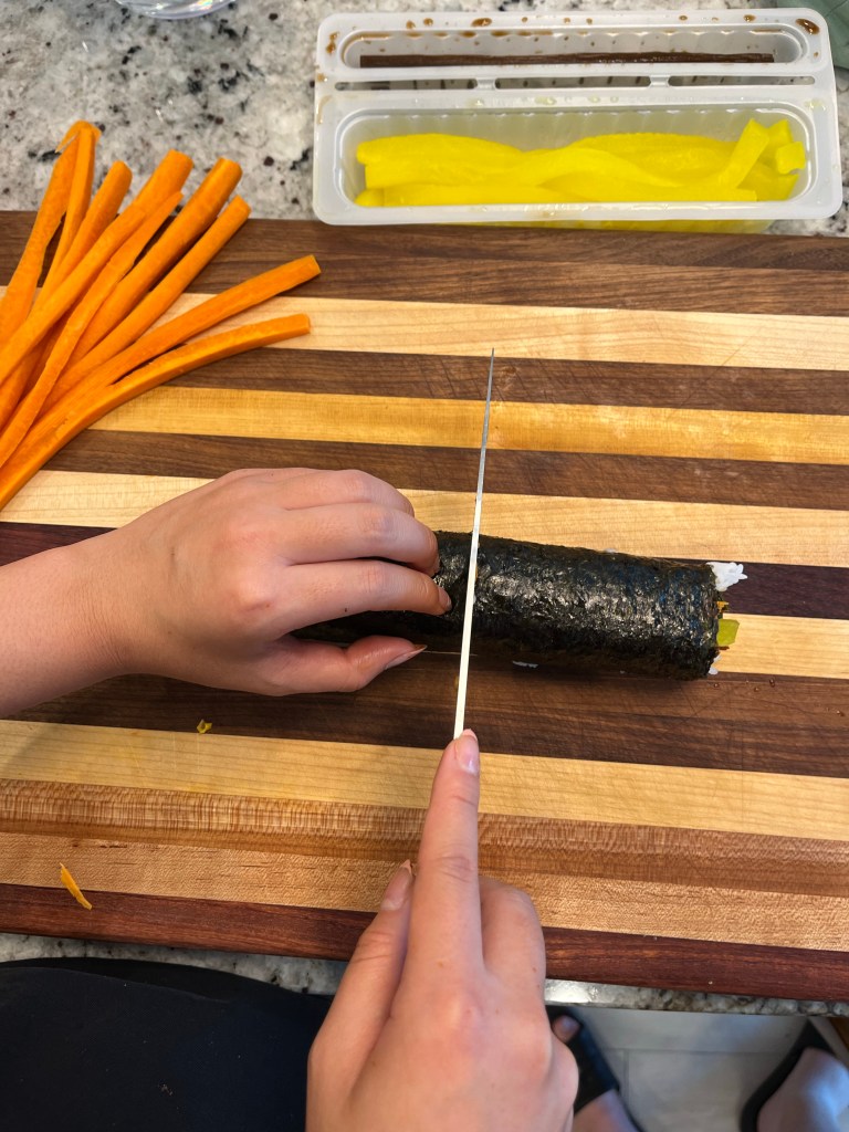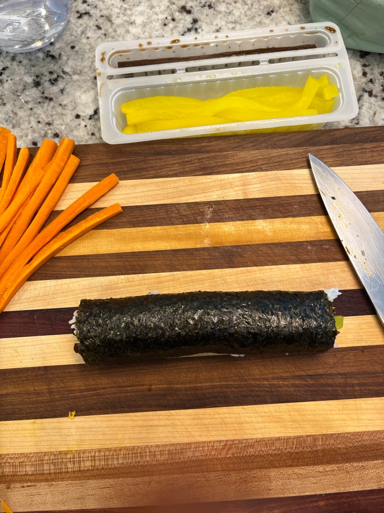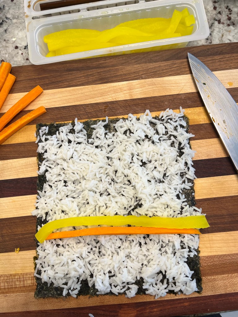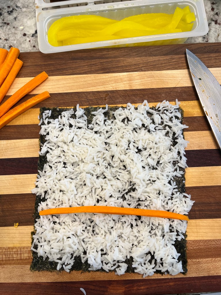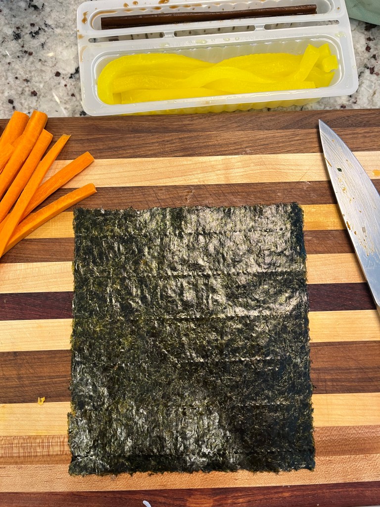 - Cut the carrot in super thin strips(the length of the seaweed sheet). Or julienne it into smaller pieces if you don’t like the crunch.