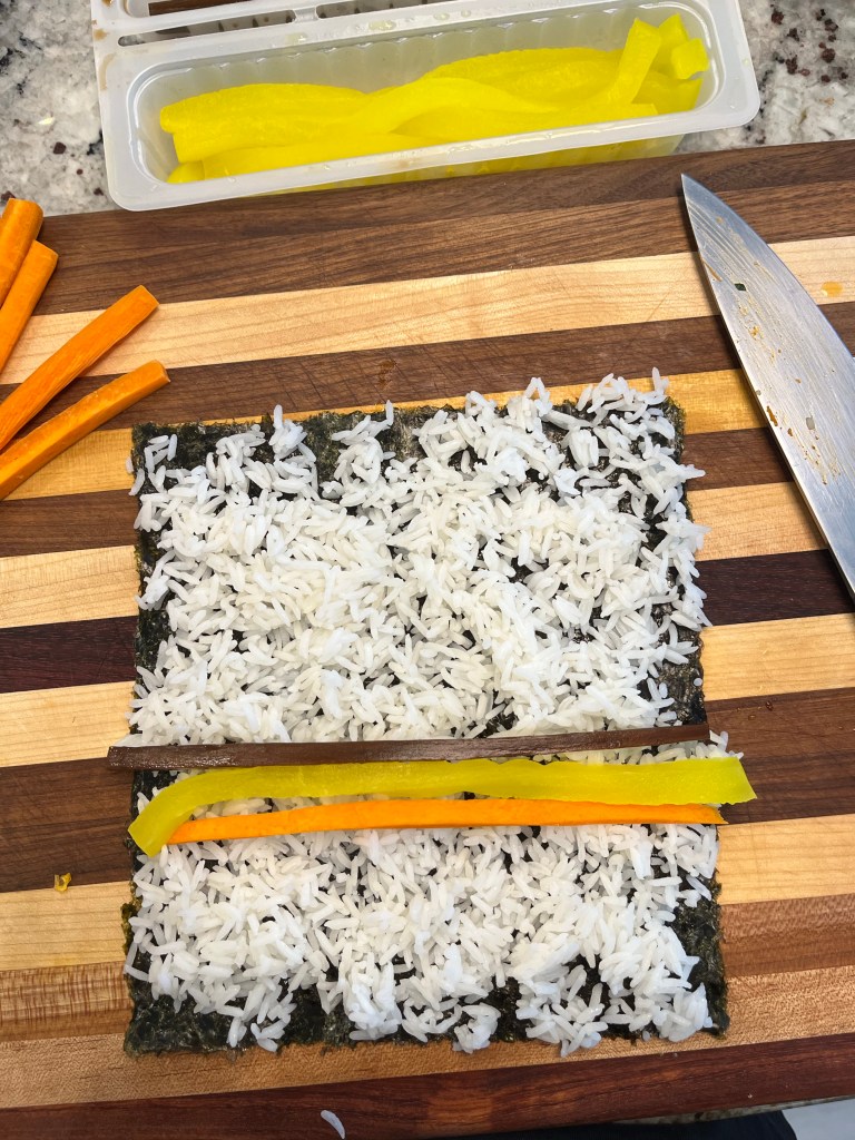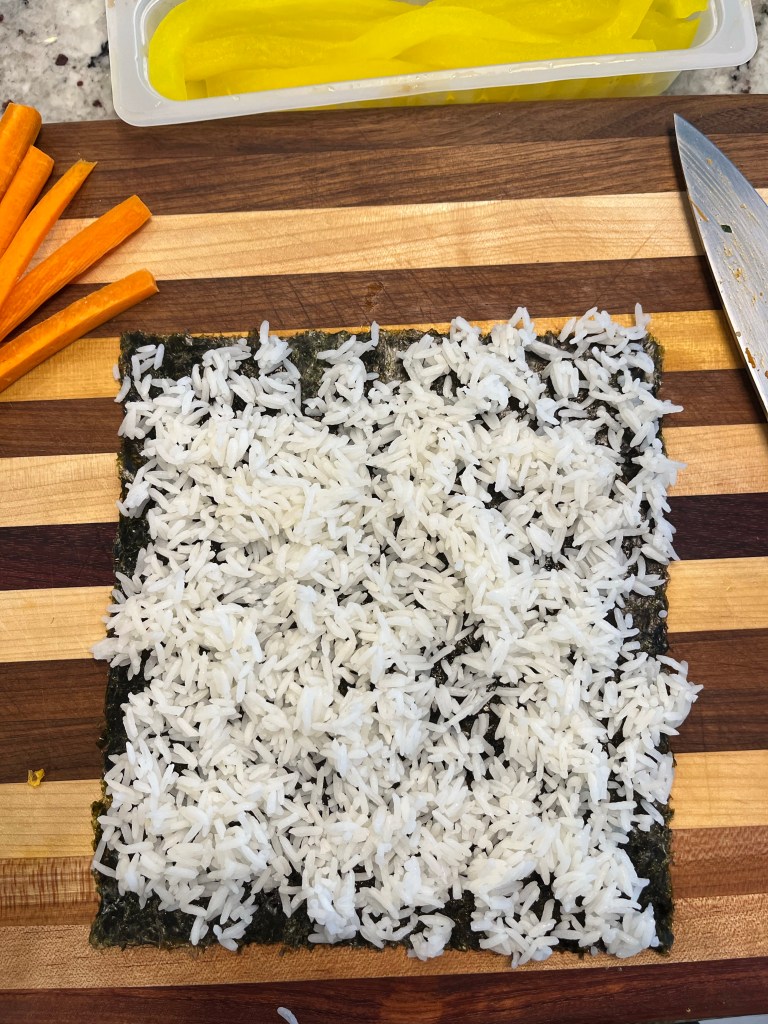- First, I would cook the rice so I can prepare all the other ingredients while it is cooking. 2 cups of rice made me 6 rolls, so you can add more or less depending on how many you want.